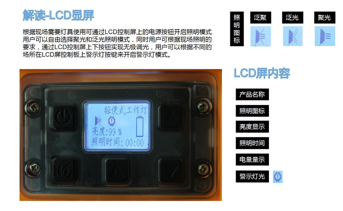 4、針對(duì)不同的照明模式,可手動(dòng)進(jìn)行10-100%的無(wú)極調(diào)光,同時(shí)可在LCD顯示屏上直觀的顯示剩余電量,預(yù)算可繼續(xù)工作時(shí)間。