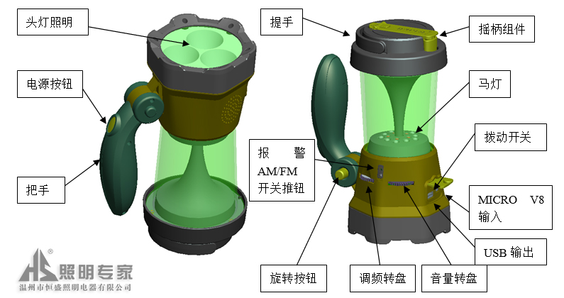 救災(zāi)多功能應(yīng)急燈通過手搖發(fā)電原理,用手搖動搖柄,經(jīng)內(nèi)部傳動機(jī)構(gòu)變速后,帶動應(yīng)急燈內(nèi)置電機(jī)發(fā)出交流電,再經(jīng)整流穩(wěn)壓后轉(zhuǎn)換為直流電,對內(nèi)置電池充電,達(dá)到能量轉(zhuǎn)換并儲能的目的;采用集成電路芯片,由三檔撥動開關(guān)切換報警功能和頻段:FM-AM(調(diào)頻-調(diào)幅),頻率及音量手動旋鈕調(diào)諧,收音為手動搜索選臺方式:選擇你喜歡頻道率收聽;救災(zāi)多功能應(yīng)急燈還具有照明、手搖對電池及數(shù)碼類產(chǎn)品充電功能。
