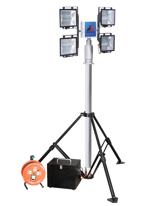 3.1 燈具下部氣桿采用可調(diào)式三腳支架支撐,在不超過 15°的斜坡、 碎石路面及面積狹窄的地方均能可靠固定;發(fā)電機組底部裝有萬向 輪,可在坑洼不平的路面上方便移動。