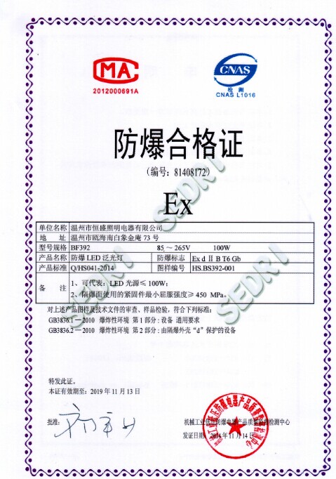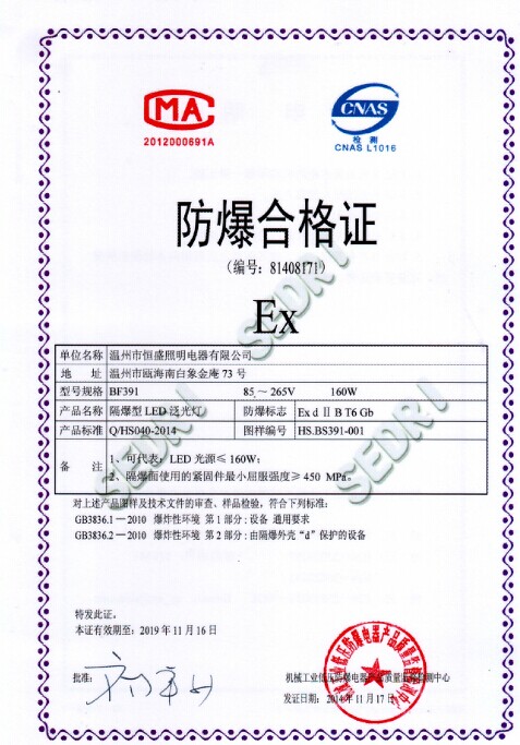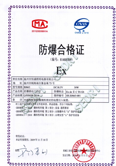 更多防爆合格證可以通過(guò)聯(lián)系恒盛照明公司查詢(xún)了解,公司始終以品質(zhì)為第一,努力打造防爆移動(dòng)工作燈、佩戴式防爆強(qiáng)光照明燈、節(jié)能防爆強(qiáng)光電筒、防爆LED泛光燈等為主的防爆燈具生產(chǎn)基地。