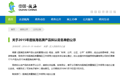 甌海區(qū)人民政府網(wǎng)站最近發(fā)布公告稱:根據(jù)《甌海區(qū)名牌產(chǎn)品認(rèn)定和管理辦法》規(guī)定,按照“科學(xué)、公開、公正、公平”的原則,經(jīng)企業(yè)自愿申報,并經(jīng)資格審查、現(xiàn)場評價和甌海區(qū)質(zhì)量強區(qū)工作領(lǐng)導(dǎo)小組全體會議審議通過,擬認(rèn)定溫州市恒盛照明電器有限公司的燈具等17個產(chǎn)品為2015年度甌海名牌產(chǎn)品。此次同步進入的同行還有浙江正輝照明工程有限公司及浙江森馬企業(yè)等知名企業(yè)。