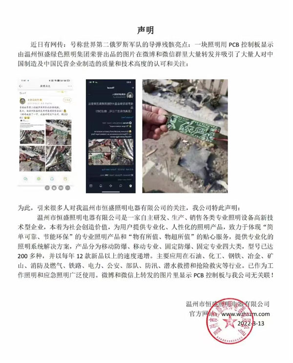 聯(lián)系人:劉經(jīng)理近日有網(wǎng)傳:號稱世界第二俄羅斯軍隊的導(dǎo)彈殘骸亮點:一塊照明用PCB控制板顯示由溫州恒盛綠色照明集團榮譽出品的圖片在微博和微信群里大量轉(zhuǎn)發(fā)并吸引了大量人對中國制造及中國民營企業(yè)制造的質(zhì)量和技術(shù)高度的認可和關(guān)注: